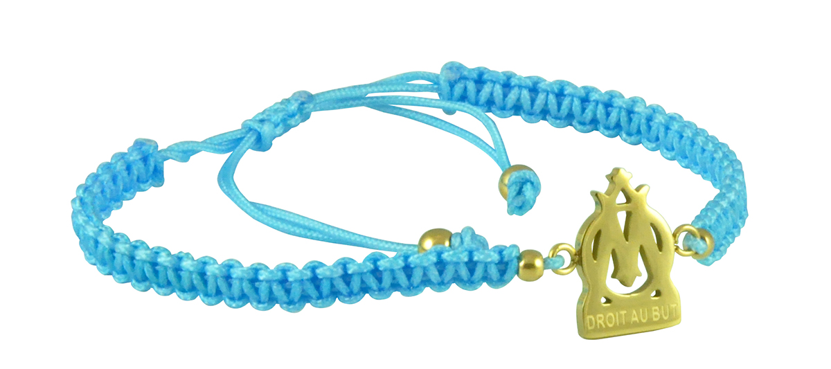 Bracelet fantaisie, sujet "Logo OM" en acier inoxydable et anallergique doré à l'or fin. Bracelet bleu cyan en corde tressée, réglable. Perles acryliques.